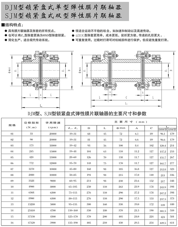瑞安市寶德隆機械配件有限公司提供DJM型鎖緊盤式單型彈性膜片聯軸器SJM型鎖緊盤式雙型彈性膜片聯軸器具有拆裝方便,快速安裝等特點,廣泛用于連接/固定輪轂孔和零件的軸,例如齒輪,錐齒輪,鏈輪,葉輪,凸輪,皮帶輪和飛輪等軸的聯結固定,咨詢電話:18906872378